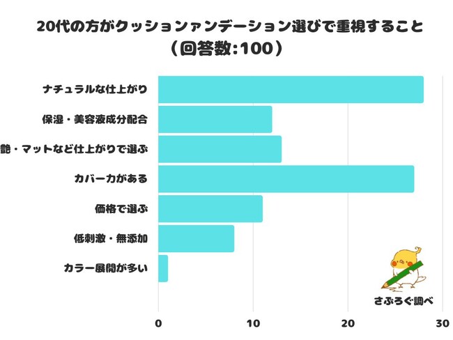 20代の方がクッションファンデーション選びで重視することをアンケートにて調査したところ、1位は「ナチュラルな仕上がり」でした。