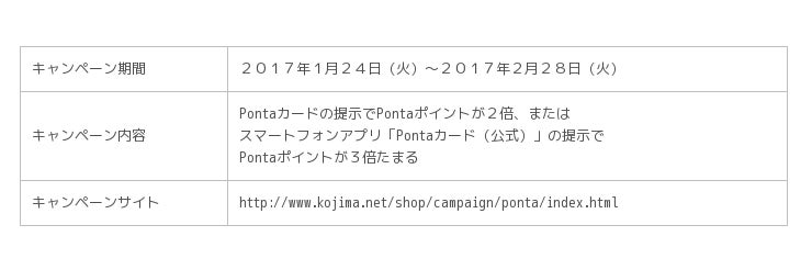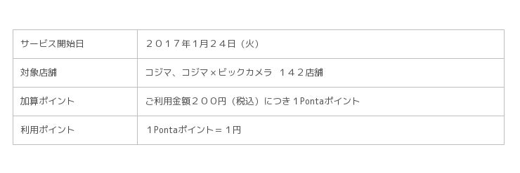 ビックカメラグループの株式会社コジマ(本社:栃木県宇都宮市、代表取締役会長兼社長 木村 一義、以下「コジマ」)と共通ポイントサービス「Ponta(ポンタ)」を運営する株式会社ロイヤリティ マーケティング(本社:東京都渋谷区、代表取締役社長 長谷川 剛、以下「LM」)は、2017年1月24日(火)より、「コジマ」全142店舗(2017年1月現在)にて、Pontaポイントがたまる・つかえるサービスを開始します。