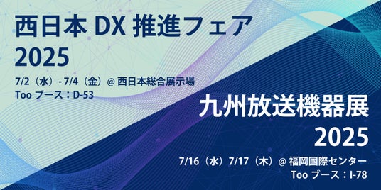 クリエイティブ市場の総合商社・株式会社Too(本社/東京都港区虎ノ門3-4-7、社長/石井剛太、以下Too)は、2025年7月2日(水)- 4日(金)に西日本総合展示場で開催される「西日本DX推進フェア2025」と、2025年7月16日(水)- 17日(木)に福岡国際センターで開催される「九州放送機器展2025」に出展します。