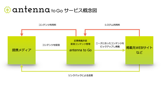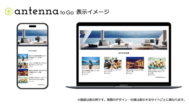 当社が新たにローンチしたサービス「antenna to Go」は、その名のとおり当社が2012年以来運営してまいりましたキュレーションメディア「antenna」を母体とした法人向けコンテンツ配信プラットフォームです。「antenna to Go」を導入した法人クライアントは、当社提携メディアの魅力的なコンテンツの中から自由に選んだものを、サイト内に画像リンクの形で表示することができます。これまでantennaがアプリやWEB版のサービス内でコンテンツを掲載・配信していたのに対し、antenna to Goでは世の中に存在するさまざまなWEBサイトに設置されたantenna to Go専用の表示枠がコンテンツとユーザー(一般生活者)との接点となります。従来単一のサービス内で完結していたコンテンツ配信の仕組みを広く解放していくことで、これまで以上に多くのコンテンツを、それぞれのコンテンツに合うユーザーへ届けてゆくことが可能になります。