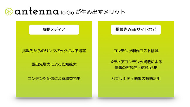 一方、コンテンツを配信するメディアにとっては、WEB上でのコンテンツの露出先が増えることによる認知拡大やトラフィック増加といったメリットに加え、コンテンツ配信の対価を得ることができます。antennaで培った配信システムを援用することで、負担なくコンテンツの収益化が期待できます。