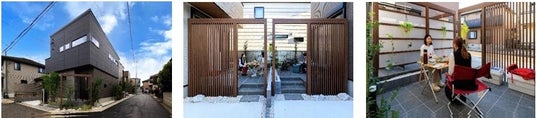 作品の概要 : 街並みの角にある四角い門状のフレームと中央にある四角いテラスが特徴。ミニキャンプ など家族の過ごし方や住人同士のコミュニケーションを創出し、日常生活を形作っていま す。テラスは、格子に包まれた開放感とほどよいサイズにより、コンパクトでありながら内 部と外部をつなぐ居場所になっています。