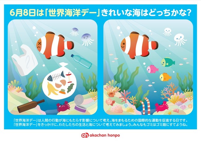 赤ちゃん本舗が行うSDGsの取り組みの一環として、今回「世界海洋デー」を多くの方に知ってもらうために、店頭でお客さまを対象に啓発活動を行いました。お子さまには魚や海のイラストをご覧いただき、楽しみながら環境について学んでいただき、海をきれいに保つために日頃からできる取り組みを知ってもらいました。