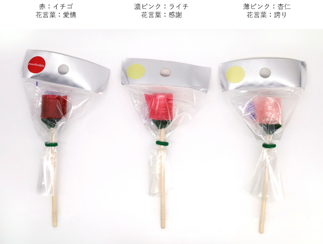 「感謝の気持ちをどのように伝えたいか」によって選んでいただけるように、赤・濃ピンク・薄ピンク、それぞれの色のバラの花が持つ花言葉をモチーフにした、3種のフラワーロリポップを揃えました。通年販売している赤色のイチゴ味に加え、濃ピンクにはライチ、薄ピンクには杏仁を期間限定で採用し、それぞれの色に合うフレーバーで仕上げました。PAPABUBBLEの職人が1つ1つ手作りしているので、1つとして同じものはなく、お母さんを想像しながらぴったりなものを選んでいただけます。