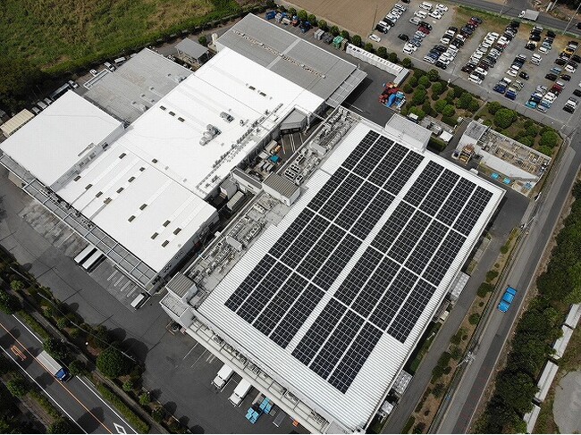 東京工場は埼玉県加須市に1994年に開設し、牛丼に使用する牛肉や玉ねぎ、たれなどを製造しています。これらを製造する棟の屋上へ2023年9月から太陽光発電設備を設置しました。太陽光により発生する電力は全て東京工場で消費、循環しています。太陽光発電設備を設置したことで、CO2排出量は年間195t削減し、製造棟屋根裏の温度※は約10℃、室内側天井付近の温度は約3℃低減する見込みです。※6~9月の間、5時間/日の日照時間の場合