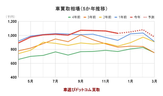 車選びドットコムの過去5年間のデータ分析によると、昨年の買取価格は9月から10月にかけて過去最高値を記録しました。1月は年末の繁忙期が一段落して下落傾向が見られますが、買取平均価格は依然として100万円を超えて推移しています。