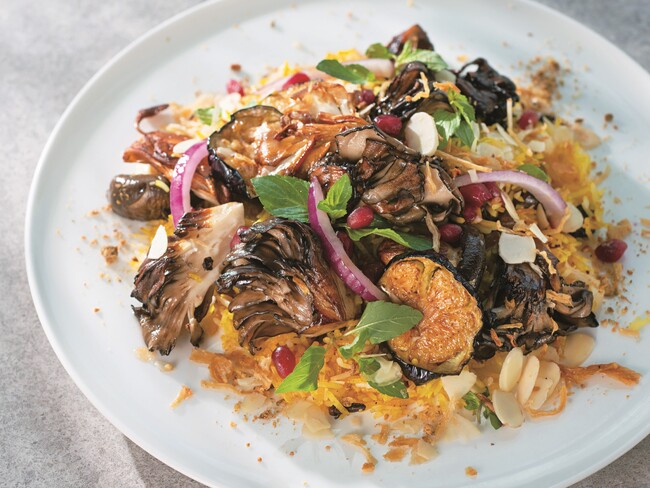 今秋のニルヴァーナのイチ推しはビリヤニ。秋茄子ときのこの秋の味覚をたっぷり使ったベジタリアン対応のひと皿です。彩り豊かなサラダはベビーリーフにいちじくとブルーベリー、フェタチーズをミックスしたNY風。