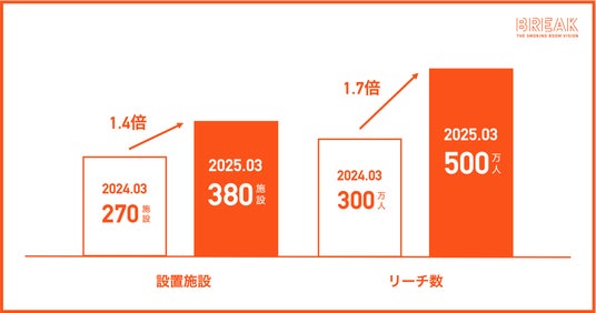 東京都では受動喫煙防止や街の美化のため、各自治体で路上喫煙が禁止されています。また大阪エリアでも、大阪・関西万博の開幕に合わせて2025年1月27日から市内全域が路上喫煙禁止になりました。このような社会的な背景から、都心オフィスエリアを中心に喫煙所利用の需要が高まり、「BREAK」の設置台数やリーチ数も拡大しました。2025年3月時点で479面にサイネージを設置し、前年同月比で設置数は約1.4倍、月間リーチ数は約1.7倍の500万人に到達しました。