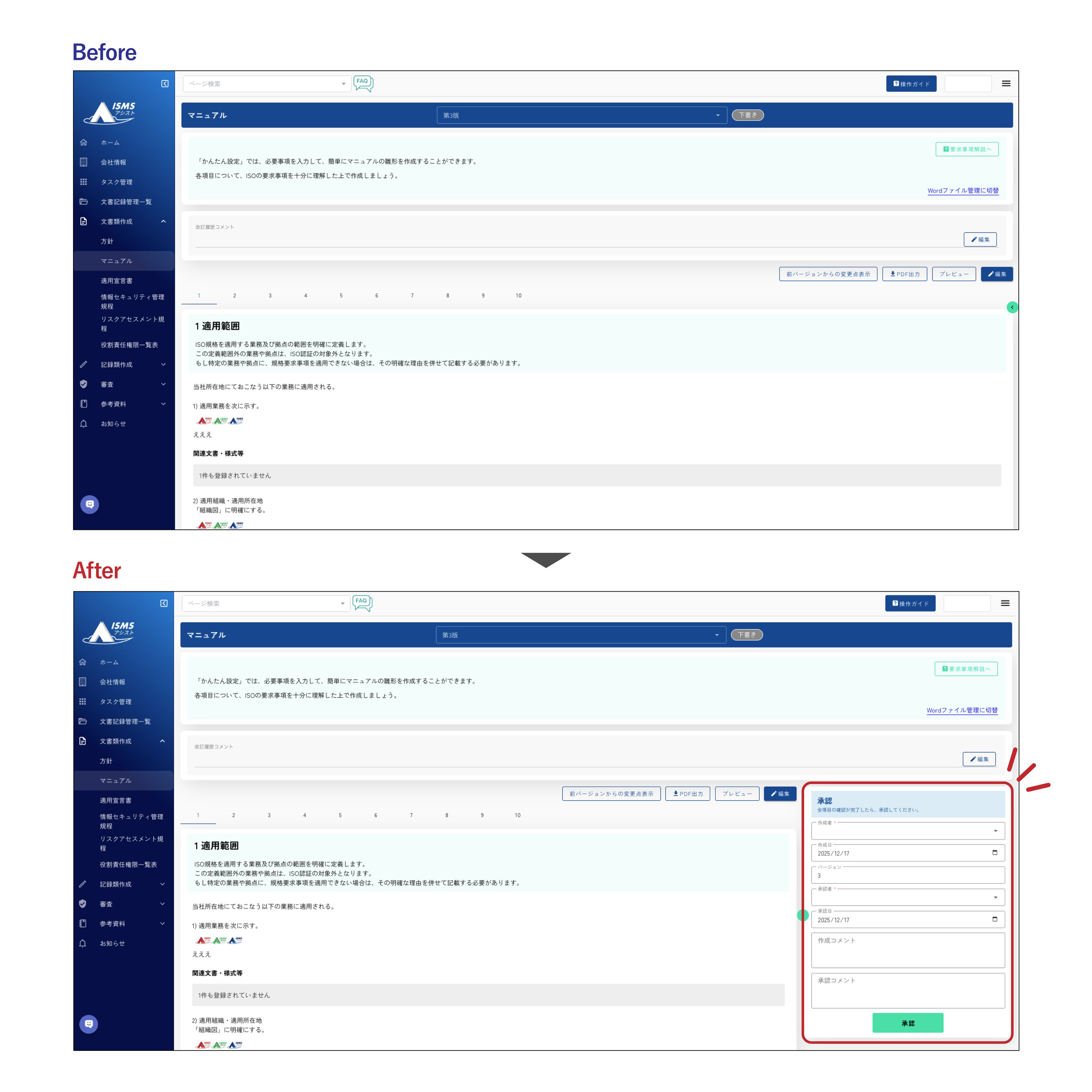 これまで、クラウド型Pマーク/ISO管理ツール『Pマークアシスト』『ISMSアシスト』『9001アシスト』『14001アシスト』における文書承認機能では、マニュアルや規程類など縦に長い文書の場合、承認ボタンがページ最下部に配置されており、全文をスクロールしなければ承認操作が行えない仕様となっていました。そのため、承認作業における操作負担や、確認と承認を行き来する煩雑さが課題となっていました。