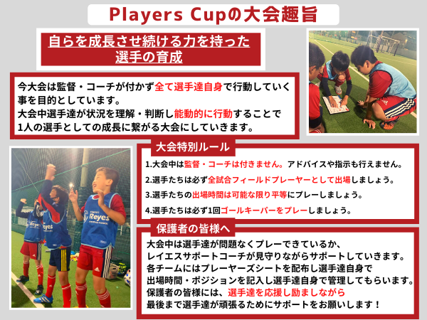 東急Sレイエスフットボールスクール横浜金沢にて、Playes Cupの開催が決定いたしました。今大会は、通常のレイエスカップ(フットサル大会)とは異なり、『普段のサッカーチームに限らず、友達同士でチームを作っての参加も可能』・『大会中は、監督・コーチは付かずに全て選手達自身で取り組む』という特徴があります。皆様のご参加をお待ちしております。