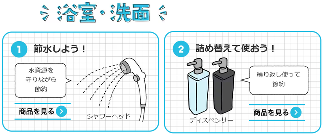 節水と水資源の保全をかなえる「シャワーヘッド」や、詰め替えることで繰り返し使える「ディスペンサー」などをご紹介