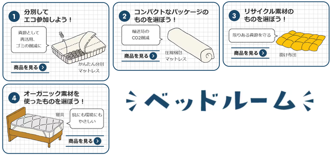 使用後の資源の有効活用まで考えて設計した「かんたん分別マットレス」や、CO2削減に貢献する「圧縮パッケージ商品」などをご紹介