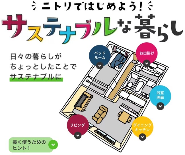 株式会社ニトリ(本社:札幌市北区 代表取締役社長:武田 政則 以下:ニトリ)より、2月上旬よりニトリネット上で公開した「ニトリではじめよう!サステナブルな暮らし」特集ページをご紹介いたします。