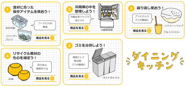 本特集では、「日々の暮らしがちょっとしたことでサステナブルに」をコンセプトに、新生活シーンに役立つ「環境にやさしい商品」約1,000アイテムを集約。気軽に楽しみながら選べるコンテンツを目指し、「リビング」「ダイニング・キッチン」「ベッドルーム」「浴室・洗面」「お出掛け」のシーン別に、イラストを用いながらご紹介しています。