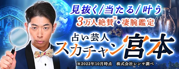 「ここまで当たるか」と絶賛の声続々! メディア出演&人気芸人仲間からも信頼厚い『占い芸人・スカチャン宮本』。人それぞれの名前や生年月日の“奥”を覗き込み、運命・真実を明らかに。迷いの原因を見抜き願いを成就へ導く独自鑑定が、今日はあなたにフォーカスします!