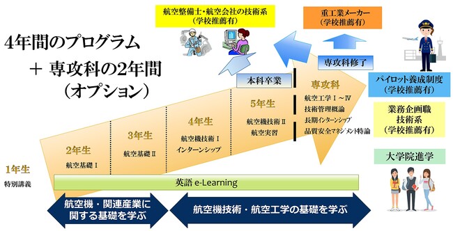 本プログラムでは、航空機関連産業に関する幅広い学修はもちろんのこと、航空整備士やメーカーのエンジニアばかりではなく、パイロットや客室などの乗務員、また運行管理など、航空機を支える様々な産業の技術者として中心的役割を担うことができる人材を育成しています。