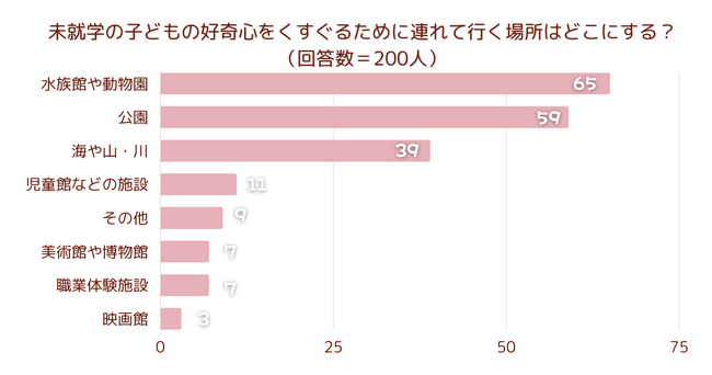 「未就学の子どもの好奇心をくすぐるために連れて行く場所はどこにする?」とアンケート調査した結果、1位は『水族館や動物園』でした。