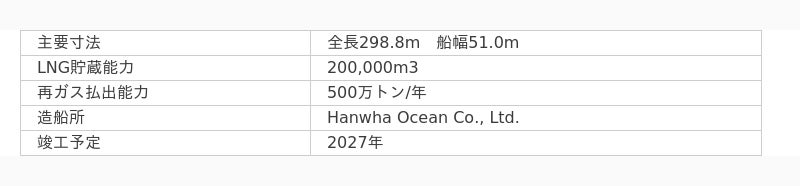(註1)FSRUは、Floating Storage and Regasification Unitの略で、LNGを洋上で受け入れて貯蔵し、再ガス化を行い陸上へ送出することができる浮体式設備です。陸上に貯蔵タンクや再ガス化設備を建設する場合と比較して、コストを抑え、かつ工期を短くできるという利点があります。