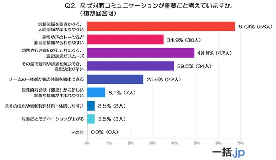 - 主な理由としては、信頼感を深めやすいこと、誤解の少ない意思疎通、課題解決のスピード感といった実務的な効果が上位に挙げられます。加えて、非言語情報の伝達やチームの一体感、偶発的な発想のきっかけなど、対面ならではの副次的な効果も一定数支持されていました。