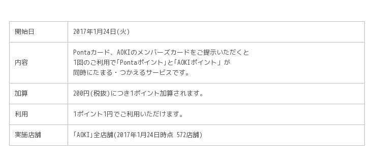 株式会社ロイヤリティ マーケティング(本社:東京都渋谷区、代表取締役社長:長谷川 剛、以下「LM」)が運営する共通ポイントサービス「Ponta(ポンタ)」は、2017年1月24日(火)より「AOKI」全店舗にて、1回のご利用で「Pontaポイント」とAOKIの提供する「AOKIポイント」が同時にたまる・つかえるサービスを開始します。