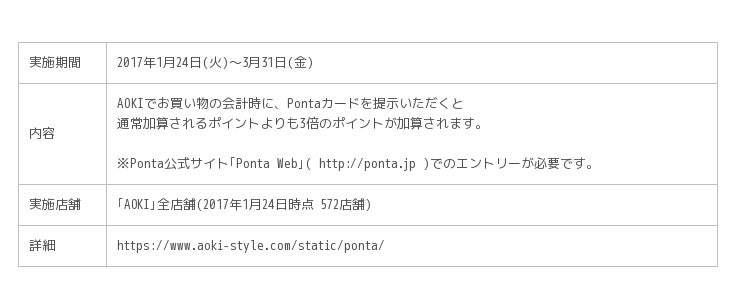 また同日より3月31日(金) まで、AOKIでお買い物をされた方を対象に「Pontaポイント」が3倍たまるキャンペーンを開催します。