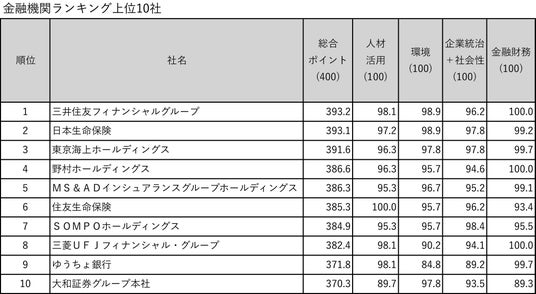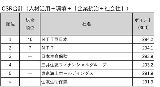東洋経済新報社「財務・企業評価チーム」が作成。対象は『CSR企業総覧(雇用・人材活用編)(ESG編)』2026年版掲載の1656社(上場1578社、未上場78社)。調査は2025年6~10月に実施。CSR分野の「人材活用」(100点満点)、「環境」(同)、「企業統治+社会性」(「企業統治」と「社会性」の合計で100点満点)の3つ(計300点満点)に、「財務」(収益性、安全性、規模、各100点。計300点満点)を加え、総合ポイント600点満点で評価。「財務」以外の項目は基本的にアンケート内容を基に評価している。ただし、一部アンケート未回答でも公開情報のみで評価を行っている企業もある。評価は原則として加点方式で行い、回答内容による減点はない。「人材活用」「環境」「企業統治+社会性」の得点はトップ企業を100点に調整。「財務」は多変量解析の主成分分析手法を用い、収益性、安全性、規模の3つの分野で評価している。