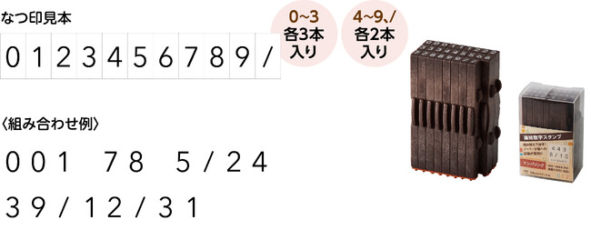 「連結数字スタンプ」は、お手持ちのノートや手帳への記録が便利にできる組み替え自由なスタンプです。柄の凹凸をはめ合わせて、タテヨコに連結することができます。ページ番号や日付などを押せる「ナンバリング」と、習慣の記録などで使える「万年カレンダー」の2タイプをご用意。「ナンバリング」は000~443までの連番と日付に対応し、「No.」「P. 」「¥」など別売りの「ナンバリング用記号」と組み合わせることでさらに用途が広がります。「万年カレンダー」は行や列をまとめて組み替えできるので、月替わりの日付変更が簡単です。曜日表記は漢字とアルファベットの2種類があります。