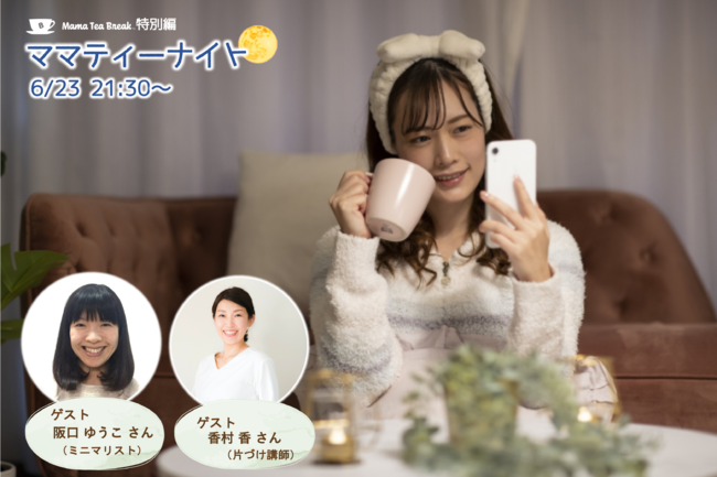 当日は、ミニマリストの阪口ゆうこさんと香村薫さんをお迎えしてお送りします。お気に入りのお飲み物で乾杯をしてワイワイおしゃべりしましょう♪ 片づけのことだけではなく、家事・育児や人間関係のこと、悩み、楽しいお話なんでもOK。