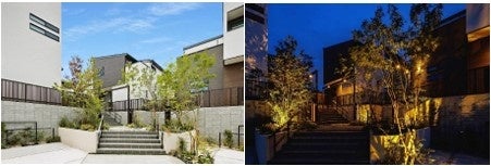 行き止まり道路に集まる3棟の分譲住宅。分譲住宅の特性を活かし、各戸が独立するエントランススペースを集約し、日常の挨拶や、子どもが安全に集まりやすいエントランスとして、小さいころから家族や両隣の家族、周辺地域の人との関係性の中で構築される子どもたちの社会性が、将来の創造的社会活動につなげることを狙いとした空間づくりをしました。