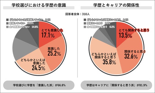 回答者全体の310人に学校を選ぶ際に学歴を意識したかを聞くと、「意識した派」は66.8%で過半数を占め、内訳は「とても意識した」17.1%、「意識した」25.2%、「どちらかといえば意識した」24.5%でした。また、学歴はキャリアに関係すると思うかを聞くと、「関係すると思う派」は 2024年の調査時から1.6%増加した81.9%となり、内訳は「とても関係すると思う」13.5%、「関係すると思う」32.6%、「どちらかといえば関係すると思う」35.8%でした。