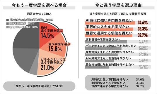 ・全体の51.3%がもう一度学歴を選べるなら「違う学歴を選ぶ」 理由1位は「AI時代に強い専門性を得たい」