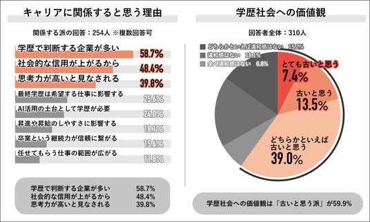 学歴はキャリアに影響すると回答した254人にその理由を聞くと、「学歴で判断する企業が多い」が 58.7%で最多となり、次いで「社会的な信用が上がるから」が48.4%、「思考力が高いと見なされる」が39.8%となりました。回答者全体の310人に学歴社会への価値観を聞くと、「古いと思う派」は2024年時の調査から変化がなく59.9%となり、内訳は「とても古いと思う」7.4%、「古いと思う」13.5%、「どちらかといえば古いと思う」39.0%でした。