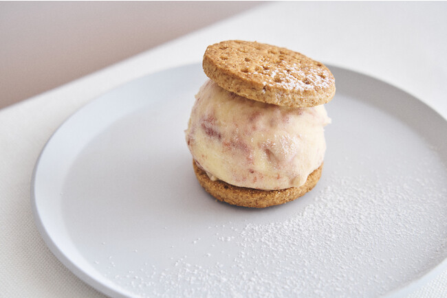 マーブル状のいちごアイスは自家製のあすかルビーコンフィチュールをバニラアイスと混ぜ合わせたもの。全粒粉の香ばしさを感じられるクッキーでサンドしました。