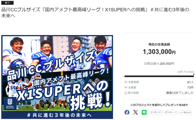 スポチュニティ株式会社(東京都 中央区、以下スポチュニティ)を利用した、品川CC ブルザイズ『「国内アメフト最高峰リーグ!X1SUPERへの挑戦」#共に進む3年後の未来へ』のクラウドファンディング支援プロジェクトは、目標金額1,200,000円を上回る、1,303,000円を達成して成功裏に終了しました。