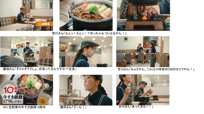 TV CMでは『牛すき鍋膳』の販売が開始した2013年と10年後で変わったことと変わらないことを描いています。2013年は吉野家で火がついた状態で鍋が提供されることに驚きがありました。今や『牛すき鍋膳』は冬の定番商品となり、その美味しさ・あたたかさから皆様に選ばれ続けています。