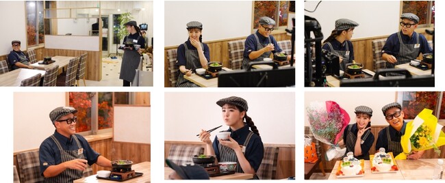宮川さんと藤田さんがTV CMで共演するのは今回が初めてです。撮影現場で顔を合わせると、これまでもアルバイト役として吉野家のTV CMに登場している藤田さんへ宮川さんが「店長になりまして」と挨拶するなど、終始明るいムードで撮影は進行しました。撮影後のインタビューでは、宮川さんは「(藤田さんは)演技も良くて。堂々としていて。食べっぷりも良くて。素敵だなと思いました。」、藤田さんは「いつもバイトを一人でほとんどやっているので、店長という存在が今回できたので、なんか新鮮で楽しかったです。」と語りました。インタビュー中には早く店長に昇格したいと言う藤田さんに、宮川さんが「いや、まだまだよ、そりゃ。いやー、そりゃ僕が言うのもあれやけども、・・・10年たってやっと店長ですよ!」と突っ込む場面も。本日公開したメーキングムービーには、息のあった二人の掛け合いなどが収められています。