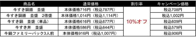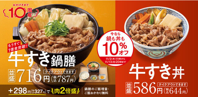 10周年を迎えることができたのは、これまで『牛すき鍋膳』をご愛顧くださった皆様のおかげです。感謝の気持ちを込めて、店内飲食の『牛すき鍋膳』を初めて割引する10周年特別キャンペーン『牛すき祭』を11月2日(木)11時から11月13日(月)20時の期間、吉野家の全国店舗※2で開催します。期間中は、店内飲食とテイクアウト※3で『牛すき鍋膳』、『牛すき鍋膳2倍盛』、『牛すき鍋(単品)』、『牛すき丼』、『牛鍋ファミリーパック』を注文したお客様のお会計より税込価格より10%引きします。対象商品は全サイズが対象となります。