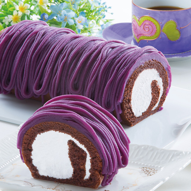 チョコをあわせたふわふわのスポンジ生地でほんのり紅いも色のクリームを巻き、スポンジ生地の上にはこだわりの紅いもペーストをたっぷりと絞った人気のロールケーキ。