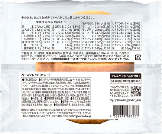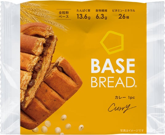 「かんたん・おいしい・からだにいい」をコンセプトに、1食(2袋)で1日に必要な33種類の栄養素の1/3がバランスよくとれる「BASE BREAD」シリーズ。「BASE BREAD カレー」は「食事感のあるラインナップがほしい」「甘いパン以外の選択肢を増やしてほしい」という声を受け、2021年2月にBASE BREADシリーズの総菜パン第一弾として発売後、2023年9月に大型リニューアル。炒め玉ねぎの甘みをベースにしたスパイスが効いたカレーを、全粒粉や大豆を使用した生地で包んだ「揚げない」ベイクドカレーパンは、ヘルシーなのに満足感ある味わいのカレーパンとして人気の高い商品です。さらに、独自の水分コントロールや製法、原材料に酢を使用するなどの工夫により、総菜パンの常識を破り、常温で約1ヶ月の保存を可能にしたロングライフパンです。