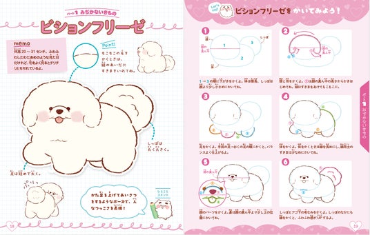 上記以外にも、小さくてかわいいいきもの、動物園で人気のいきもの、羽のあるいきもの、水族館で会えるいきものなどを、6章に分けて紹介しています。左ページのお手本イラストの描き方を右ページで順を追って紹介しているおり、マネするだけでお手本の通りに描き上がります。描く順番や位置も詳しく解説しているので、イラストが苦手な方でも大丈夫!ポーズ違いや表情違いなど、マネしたくなるお手本もたっぷり載っています。