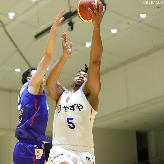 兒玉、谷口のスリーが立て続けに決まり、リードを握る福岡。トランジションバスケットを得意とする青森だが、ディフェンスリバウンドを取られてもトップからハードにあたり速攻を出させない。10点のリードを広げるもターンオーバーを連発してしまい4点差まで迫る。谷口が前半で2つのファールをし、加藤が出場。ジャンプシュート、スリーまで欲しい時に決めきりリードを渡さず、オフェンスの要となる。さらに攻守のリバウンドでパブロが主導権を握る。37本中16本とチームの半分近くのリバウンドをもぎ取り、チームに勢いを与えた。