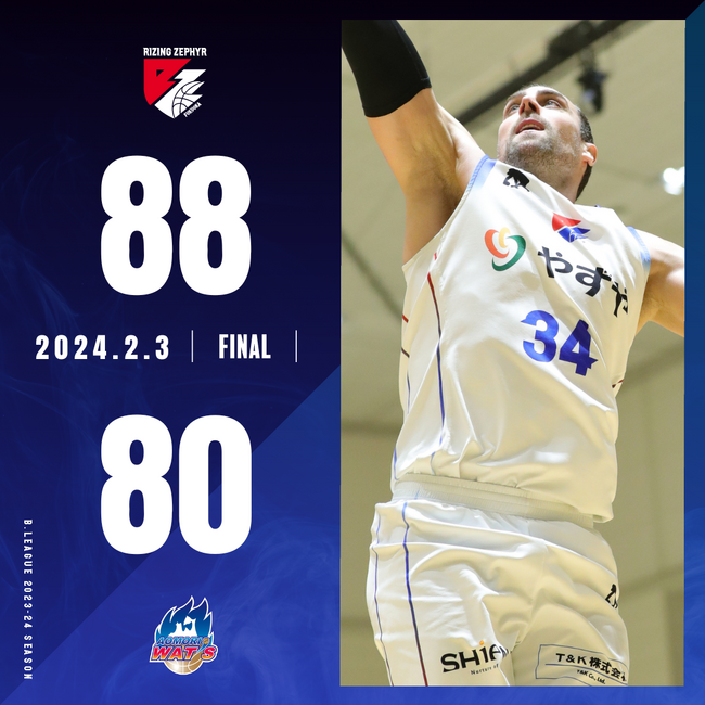 2024年2月3日(土)に開催されました【青森ワッツvs.ライジングゼファーフクオカ】において“青森80-88福岡”の結果となりましたことお知らせいたします。