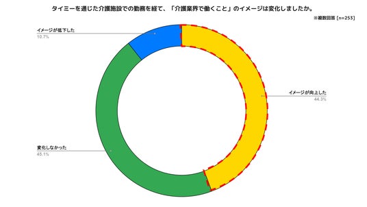 タイミーを通じた介護施設での勤務を経て、「介護業界で働くこと」のイメージが変化したかどうかに対しては、「イメージが向上した」と回答した人が44.3%でした。
