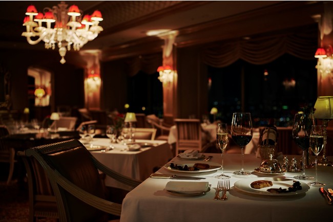 高層階のレストランで楽しむロマンチックなディナーコースや、リボンをモチーフとした上品なスイーツ。