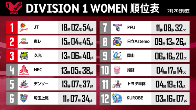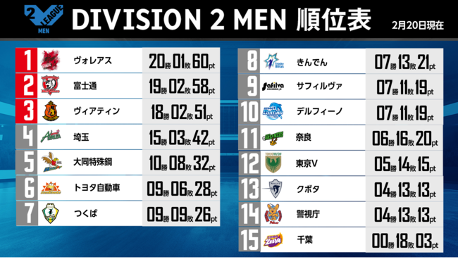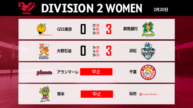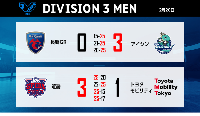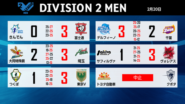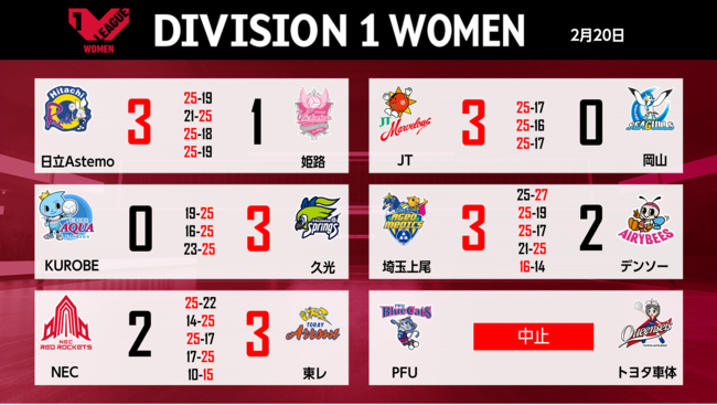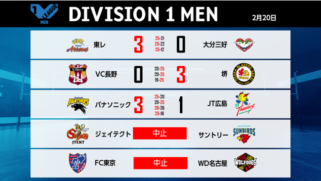 バレーボール国内最高峰リーグ V.LEAGUE【2月20日の試合結果】
