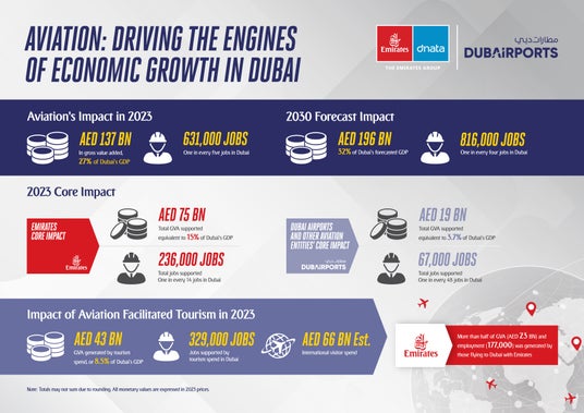 2023年、エミレーツ・グループ、ドバイ・エアポーツ(ドバイ国際空港、ドバイ・ワールド・セントラル - アル・マクトゥーム国際空港を含む)、およびその他の航空業界団体[1]で構成されるドバイの航空業界は、ドバイのGDPの27%に相当する1,370億ディルハム(373億米ドル)の粗付加価値[2](GVA)を支援したと推定されます。その内訳は、中核的な経済影響が940億ディルハム、航空業界が促進した観光による間接的影響が430億ディルハムです。この数値は今後も着実に増加し、エミレーツ・グループとドバイ・エアポーツが推進する航空事業は、2030年までにドバイの予測GDPの32%に相当する1,960億ディルハムに寄与すると予測されます(金額は2023年時点の価値)。