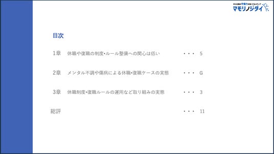 Pマーク、 ISOコンサルにおける支援実績 No.1(注1)のISO/Pマークの取得・運用支援サービス「認証パートナー」を提供し、中小企業の守備力を強くするメディア『マモリノジダイ』を運営する株式会社スリーエーコンサルティング(本社:大阪府大阪市、代表取締役社長:竹嶋 寛人)は、企業における従業員の休職および復職制度に対する理解度や、社内における休職お よび復職に関する状況を把握するため、全国の総務・労務・法務・人事担当者(主に中小企業所属)546社を対象にアンケート調査を実施しました。本調査では、企業の休職および復職の実態を明らかにするとともに、今後の課題や解決の方向性を提示しています。