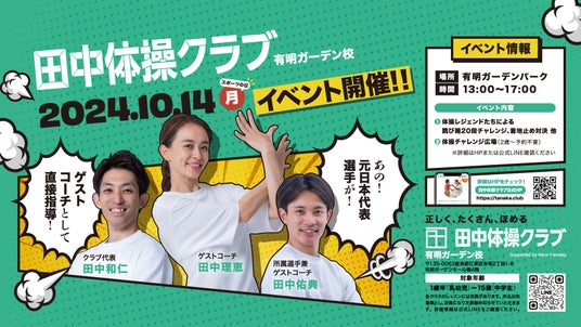 住友不動産商業マネジメント株式会社(本社:東京都新宿区 代表取締役社長:山本 直人)が運営する商業施設「住友不動産 ショッピングシティ 有明ガーデン」(所在:東京都江東区)では、「田中体操クラブ Supported by AEON Fantasy」のオープンを記念して、2024年10月14日(月・祝)スポーツの日に、子どもから大人まで楽しめる体操体験イベントを開催いたします。