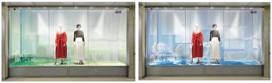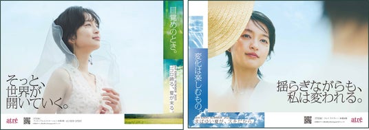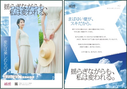 薄い布をベースにレイヤー感をだして目覚めの雰囲気をイメージ。アーリーサマーの期間は、初夏(始まり)のグリーン、レイトサマーでは夏の暮れ時をイメージしたブルーの背景でキャッチコピーの「そっと、世界が開いていく。」、「揺らぎながらも、私は変われる。」様子をそれぞれ表現。