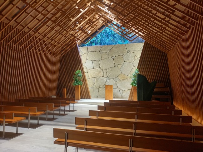 また、チャペル「グレース」や古都・東山を一望する景色と、京都市文化財(名勝)登録の回遊式日本庭園が両側の窓から望め、折上格天井、京都の三大祭を描いたステンドグラス、アンティークなシャンデリアなど和の魅力とモダンなテイストが融合した「葵殿」も見学しました。